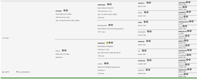 Colman Über Colman muss man nicht viel schreiben, er ist ein etablierter Vererber der Spitzenklasse. Mit über 30 gekörten Söhnen und im internationalen Sport (viele in 1,60m Springen) erfolgreichen Nachkommen hat er seine Vererberqualität vielfach bewiesen. Sein Vater Carthago ist für sein Springvermögen und Urgroßvater Marlon XX für Rittigkeit bekannt, dementsprechend sind auch viele Colman-Nachkommen im Amateursprot erfolgreich. |